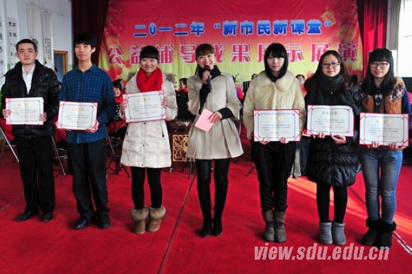 [本站讯]1月12日,2012年度济南市“新市民新课堂”公益性艺术培训成果展示展演活动在济南市群众艺术馆举行,由山东大学艺术学院学生辅导的文化节目参加了汇报展演。济南市文广新局社文处处长张君,济南市群众艺术馆党委书记、馆长马迎春,山东大学艺术学院党委书记史永志、党委副书记李海燕出席了活动。 展示展演活动在欢快、喜庆的民族管弦乐《花好月圆》中拉开帷幕,全场既有优美的成人舞蹈《春天》,也有欢快的童声合唱《蓝精灵》、合唱《四渡赤水出奇兵》。诗朗诵《人间真情》、吕剧联唱、京剧联唱等节目的一一上演,全方位展示了“新市民新课堂”公益性艺术辅导培训在声乐、器乐、舞蹈、表演等方面所取得的可喜成绩。展示活动中,出席活动的嘉宾还为艺术学院参加公益性培训的优秀学生颁发了“优秀培训教师”证书。 多年来,山东大学艺术学院作为社会实践与济南市群众艺术馆共同承担“新市民新课堂”公益性艺术辅导培训,并于2010年在济南市群众艺术馆设立山东大学学生社会实践基地。公益培训活动至今已经成功举办六年,本次成果展示展演活动是对2012年培训活动成果的全面展示。 “新市民新课堂”公益性艺术辅导培训活动成为艺术学院学生社会实践的特色活动。活动秉承文化惠民、艺术普及理念,突出活动的社会性、公益性和大众性,对广大市民,尤其是针对外来务工人员、下岗职工及其子女进行辅导培训;开办六年以来,先后开展了声乐、舞蹈、表演、器乐、美术、书法、非物质文化遗产传习及化妆等八大门类、19个分项的培训。艺术学院学生坚持每周一到周日的培训时间,参与培训近400余班次,免费辅导培训各界市民逾2.5万人次;累计参加公益培训的学生达300余人。