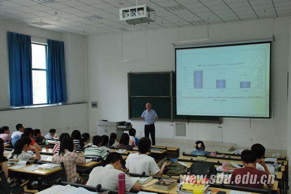 瑞典隆德大学Lars Hansson教授为学院师生作了题为“如何将环境价值转化成货币价值”的学术报告。Lars Hasson教授介绍了将环境价值转化成货币价值的必要性。他列举了美国和中国应对经济环境问题方面的举措进行了对比分析。他提到,近几年中国经济迅猛发展,但是环境问题成为中国经济发展的一个不容忽视的问题,其中空气污染和水污染每年带来的环境损失很大。此外,Lars Hasson教授介绍了如何将环境价值转化成货币价值。他在论述政府应在经济利益和环境利益之间做好权衡取舍,实现经济和环境的双赢这一命题时,引用了中国古典阴阳理论,深入浅出、生动形象地诠释了经济和环境的相关性。同时,他提出了实现经济和环境双赢的措施:征收碳排放税、允许碳排放许可证进行市场交易等。他还列举了成功的案例,如洗煤技术的应用,不仅提高了煤炭的利用率,同时也保护了环境。