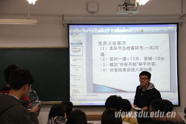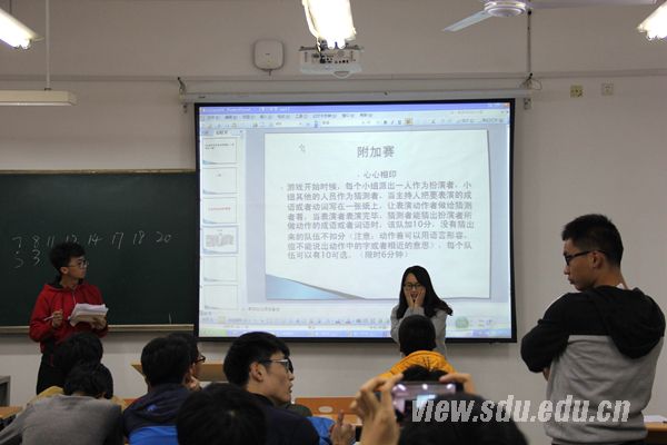 首先主持人简要地介绍了本次比赛的流程和相关规则,并宣布比赛正式开始。第一环节为选择题,由工作人员用PPT放映题目,各组选手依次在答题纸上写下答案,30题过后,工作人员进行分数统计。第一环节过后,场上剩下18支队伍。第二环节为轮答题,即场上小组轮流作答,每组有4道题目。本环节的得分与上一环节的得分进行累加,最后得分较高的8支队伍进入第三环节。第三环节为抢答题,每道题答对加15分,答错减10分。第三环节过后,各队伍的比分相差不大,比赛进入了附加赛。附加赛环节,每支队伍派出一人作为扮演者,队伍其他人员作为猜测者,每队有10个词语可以选择,限时5分钟。经过一番精彩的演绎和各队的默契配合,最后6支优秀的队伍脱颖而出。现场的工作人员为他们颁发了奖状,并合影留念。