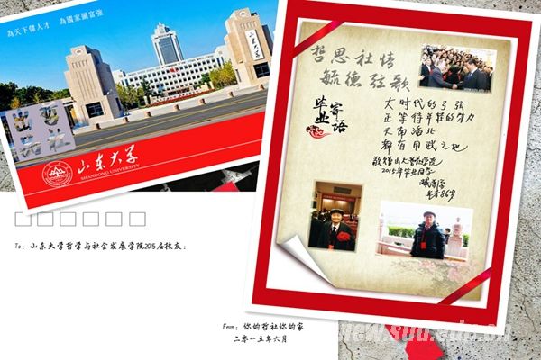 接下来,同学们展示了前一阶段毕业教育活动成果,将“昨日春华秋实感山大情深,明天饮水思源做国之栋材”、“心系数不清的山大时光,挥别道不完的珍重之情”等条幅悬挂于学院中,感激母校母院的培养;现场发放山大风景明信片,毕业生为自己的父母写一段话,感激双亲养育之恩;宣读了《哲社学院2015届毕业生廉洁诚信倡议书》和《文明离校倡议书》,号召所有毕业生“敬廉崇洁、诚信做人”,文明离校,安全毕业。然后,学院为每一位2015届毕业生发放哲社师生自主创意、设计的印有“致2015届校友”标示的毕业大礼包。为传承学校“荣我山大”的捐赠文化,倡议每一位毕业生向即将步入大学校园的2015级新生捐赠,以表达自己的一份心意。所有款项将用于资助学院2015级家庭经济困难学生,体现饮水思源反哺山大、哲社精神薪火相传之意。