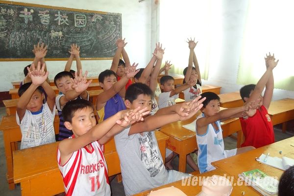 章丘市白云湖镇高桥小学位于章丘市白云湖镇高桥村,从山东大学乘车到高桥小学需经三个多小时。活动定于下午两点开始,为保证按时到达,队员们早上八点就已集合出发,到达学校时已将近中午。高桥小学全体师生非常支持和配合志愿服务队的活动,虽在假期,下午不到一点,大多数参加活动的同学们就已来到学校,孩子们在好奇和兴奋中等待着活动开始。为了吸引孩子们的注意力、提高孩子们学习安全知识的兴趣,队员们先为到场的孩子们播放“不去湖边游野泳”的动漫科普视频,让动画中深受小学生喜爱的“黑猫警长”为孩子们娓娓道来游泳的注意事项和游野泳的危害。针对溺水后需要采取的必要急救措施,志愿服务队队长李兰为孩子们介绍了心肺复苏术。在进行了必要的技术和操作要领讲解后,同学们在大学生志愿者的指导下利用队员们带来的模拟假人进行实际操作和练习。“按压位置在胸骨与两个乳头连线的交界处,掌根按压,手臂要直不能打弯”,孩子们嘴里喃喃念着大哥哥、大姐姐教给的口诀,一边对着模拟假人认真地做练习。山东大学口腔医学院的志愿者与孩子们就口腔保健知识进行了趣味互动,在提问和演示中让孩子们学会了如何正确使用牙刷刷牙,并让孩子们意识到吮唇、托腮等小动作有碍于口腔的正常发育。志愿者们在活动中将准备好的礼物发放给孩子们,以激发他们们参与活动的积极性。就孩子们比较容易发生的外伤和出血等意外伤害事件,李兰选取头部、手臂和膝盖等小学生易于受伤的部位讲解了如何使用三角巾和绷带进行简单包扎。操作要领介绍完毕后,孩子们两人一组,利用手中的三角巾互相包扎巩固所学知识。
