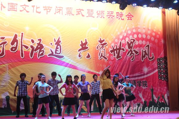 王俊菊首先致辞,对外国文化节给予了高度评价,表示文化节已经成为学院人才培养的重要形式,并对外院学子提出了更高的要求与期待。接着,晚会在一片愉快的气氛中拉开帷幕。本场晚会共设三个颁奖环节,分别对在外国文化节各个活动中取得优异成绩的个人和集体进行表彰,期间穿插了节目表演。在表演中,“乐感地带”外语歌曲舞蹈大赛的“舞后”,将牛仔、伦巴和桑巴三种舞蹈元素串烧融合在了一起;“新生代”双语配音大赛三届选手同台献艺,进行了生动的配音表演——《美女与野兽》选段,将观众带入了电影中;中英文双语朗诵《青春万岁》别具特色,将语言这门独具魅力的艺术发挥的淋漓尽致;作为全校唯一一个外语剧社的尼诺剧社带来的歌舞剧《glee》,则散发出学子们青春蓬勃的朝气。此外,晚会还邀请到了2006级日语系校友孙鸣宇和即将毕业离开校园的2008级俄语系胡震,他们分别用自己动感的舞蹈和动人的歌声表达了对母校的依恋之情。外语学院部分系负责人、外教和各年级辅导员以及来自山东财经大学、山东建筑大学、山东师范大学、济南大学和济南外国语学校的学生代表参加了晚会。其中,济南外国语学校和济南大学的学生代表还带来了精彩的节目。