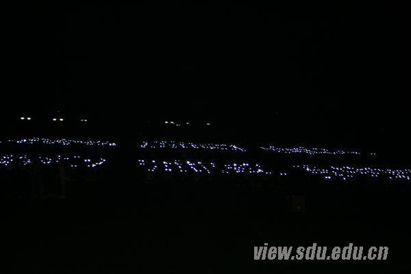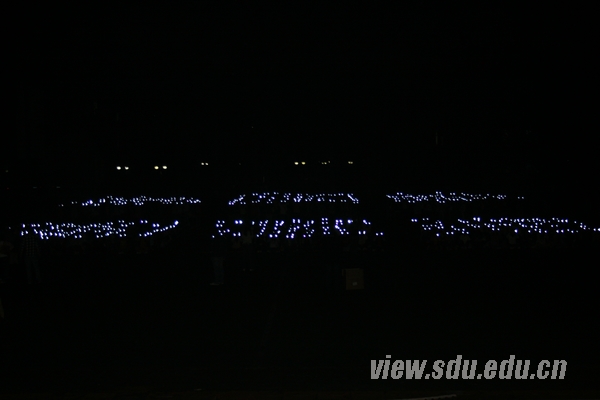 活动中,学院学子们在洪家楼校区操场集合,有序地站到提前布置好的活动场地上。“为天下储人才,为国家图富强”是山东大学的办学宗旨。同学们手持红蓝两色的校庆纪念手电,摆出“为国家图富强”六个大字的造型。在辅导员的指挥下,同学们齐心协力,一遍又一遍地排演着。灯光点点闪烁,点亮了操场,也点燃了同学们对山大的热爱之情。六个大字组成的绚烂夺目的造型,与夜空中的明月交相辉映,饱含着四海之内山大学子的浩然气魄,努力学习,不断进取,也饱含着为祖国明天的富裕和强盛而奋斗的决心和意志。山大之夜,洪楼之夜,因同学们手中的灯光变得璀璨,变得充满活力与感动。整体场面录制结束之后,工作人员按照计划分别对六个大字进行了单独录制。
