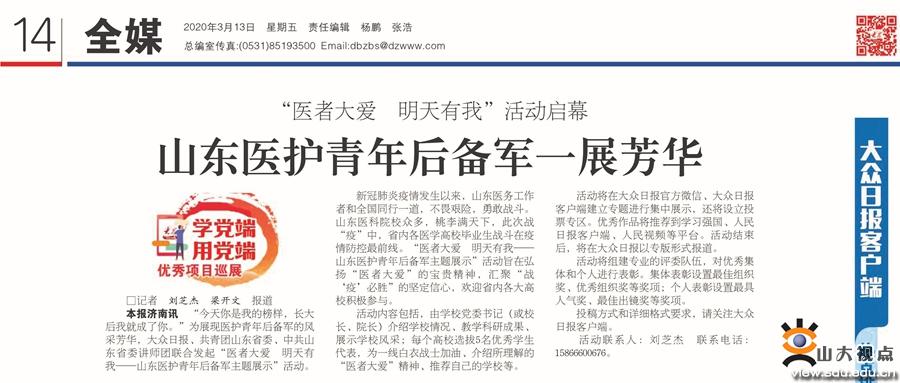 积极做好学生思想引领。公共卫生学院举行“师长有约”网上思政课,邀请齐鲁医学院与公共卫生学院领导、优秀校友等与学生“云座谈”,凝聚育人合力。基础医学院举办线上心理讲座,由心理学系主任潘芳教授主讲,帮助师生及家长有效缓解因疫情带来的心理压力和焦虑情绪,在线收看达9000余人。临床医学院Dr.cats合唱团用云合唱的形式发布《致老师书》,以歌寄情,以歌明志,致敬一线抗疫的医护老师。护理学院举办“三行情诗,以爱致敬”向一线医务人员献祝福活动,学生将心中浓浓敬意和美好期盼通过笔尖传递给一线护理前辈。行胜于言,医学生们始终牢记“除人类之病痛,助健康之完美”的医学生誓言,研究生积极参与导师团队的疫情科研攻关,学生党员主动加入一校三地疫情防控知识线上科普宣传活动和家乡的基层防疫志愿服务工作,发挥先锋模范带头作用,勇挑责任重担。