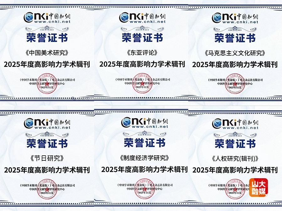 [本站讯]近日,中国科学文献计量评价研究中心发布了《高影响力学术辑刊评价报告(2025)》,遴选出各学科排名位于前25%(Q1区)的辑刊为“2025年度高影响力学术辑刊”。山东大学主办的《中国美术研究》《东亚评论》《马克思主义文化研究》《节日研究》《制度经济学研究》《人权研究》6种人文社科学术辑刊持续入选。