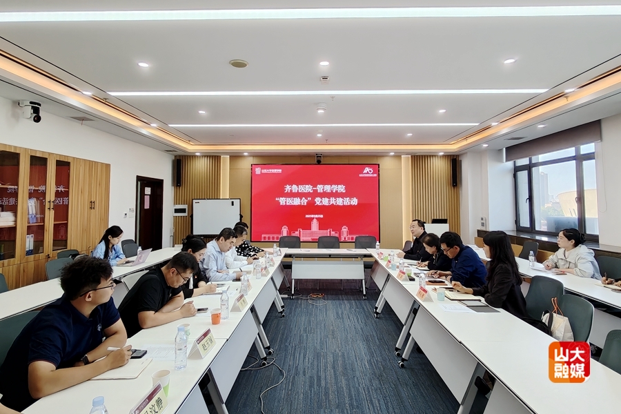 会议中,管理学院党委书记付岩志介绍了学院党建工作的整体情况与特色,阐述了党建引领在赋能人才培养、推动教学科研、支撑社会服务等关键领域的具体实践路径。校医院(卫生与健康中心)副书记巩勇围绕校医院服务师生的主要措施,介绍了校医院作为师生健康诉求第一响应者,在校园健康生态中发挥的桥梁作用。齐鲁医院医务处副处长李斌介绍了医院发展情况与组织架构体系,系统展示了其在优质医疗服务供给、高水平教育教学开展、高素质人才队伍建设等关键领域的特色成果。齐鲁医院机关党总支副书记王敏介绍了医院机关党总支的具体实践经验与创新做法,表示要将党建工作与业务工作深度融合,赋能高质量发展。管理学院正处级组织员卞江结合学院业务组织形式和教学管理特色,将医院科普资源如何融入学院契合师生需求,拓宽合作内涵展开交流。齐鲁医院医务处合作办医办公室副主任李沁蓉围绕“送健康”和“促融合”,表示将把服务师生需求的具体行动做得更实,把党建业务融合走得更深,让“医疗专业”与“管理智慧”在党建的引领下同频共振,在共建工作中碰撞出更多火花。双方还就进一步发挥党建引领作用,创新医管协同、推动人才培养合作等主题展开讨论。