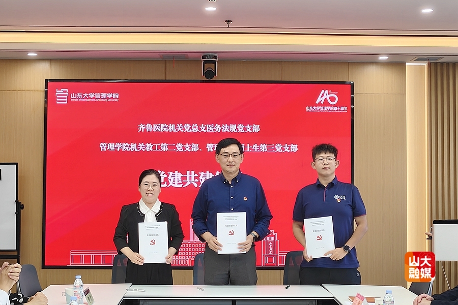 齐鲁医院机关党总支医务法规党支部、管理学院机关教工第二党支部、管理学院硕士生第三党支部共同签署党建共建协议。