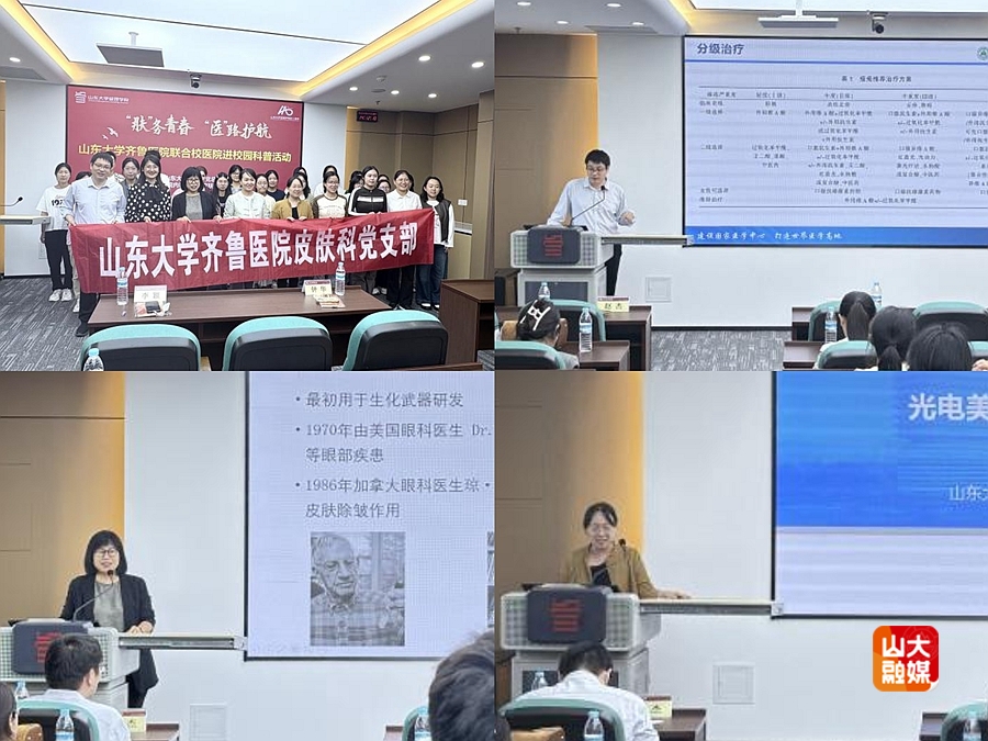 科普讲座中,齐鲁医院联合校医院以“‘肤’务青春,‘医’路护航”为主题,聚焦学生普遍关注的皮肤健康问题,由齐鲁医院皮肤科副主任李颖、主任医师钟华、主治医师赵杰进行三场专题讲解,系统介绍了医学原理、日常预防、规范治疗等,为青年学生提供了实用的健康指导。