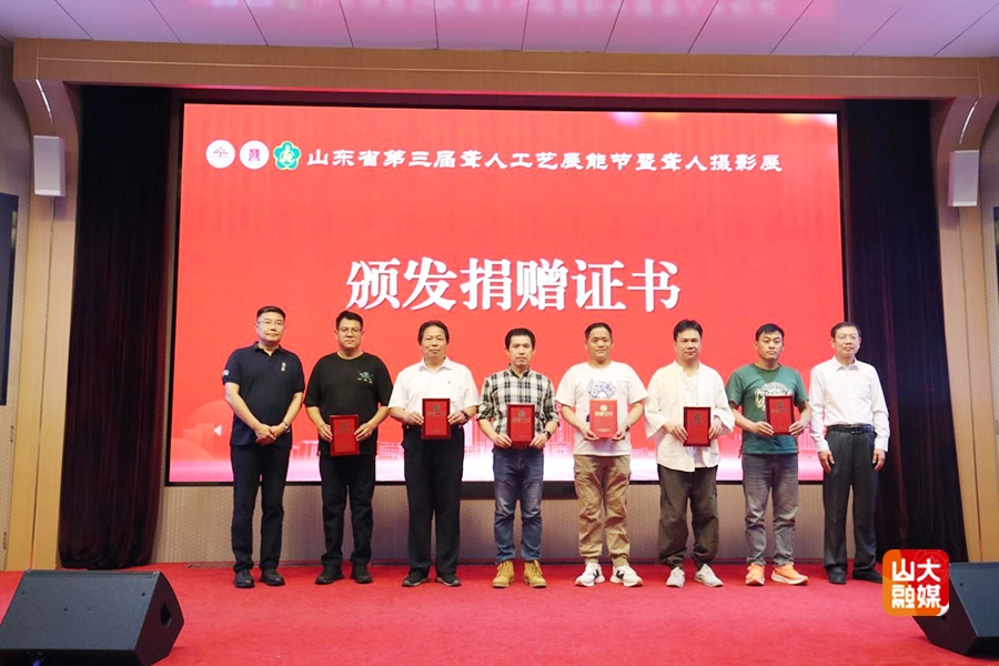 现场还举行了捐赠证书颁发仪式。山东大学哲学与社会发展学院党委书记梅强、山东大学残疾人事业发展研究中心主任葛忠明共同为艺术家代表们颁发捐赠证书。