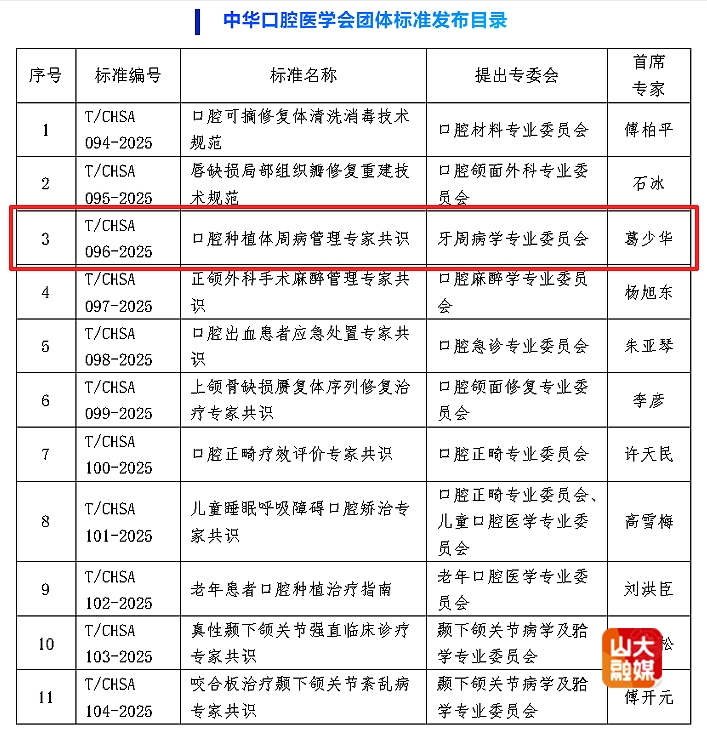 [本站讯]近日,中华口腔医学会发布11项团体标准,口腔医学院(医院)葛少华教授团队牵头制定的《口腔种植体周病管理的专家共识》入选。