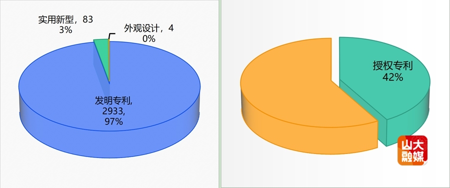 专利公开类型和授权专利数量如下图所示,公开类型以发明专利为主,有2933件(其中已授权发明专利1173件),实用新型83件,外观设计4件。上述公开(公告)专利中授权专利有1260件,占2025年第一、二季度山东大学全部公开(公告)专利的42%。