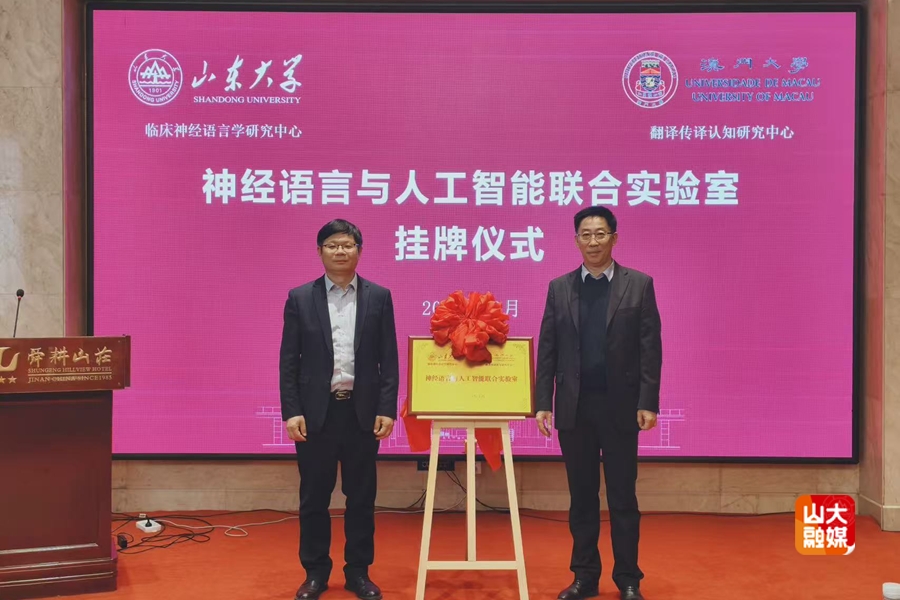 [本站讯]10月25日,山东大学临床神经语言学研究中心与澳门大学翻译传译认知研究中心共建的“神经语言与人工智能联合实验室”揭牌成立。揭牌仪式由山东大学临床神经语言学研究中心主任马文与澳门大学翻译传译认知研究中心主任李德凤共同主持,标志着两校在人文科学与前沿技术交叉领域开启了协同创新的新篇章。