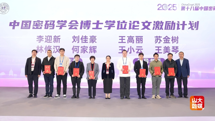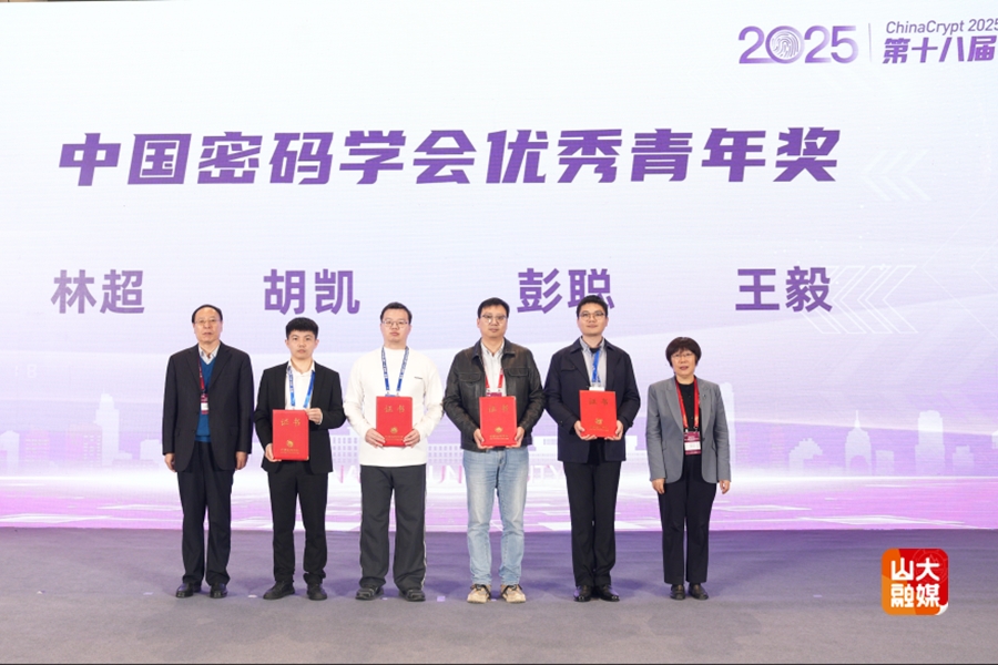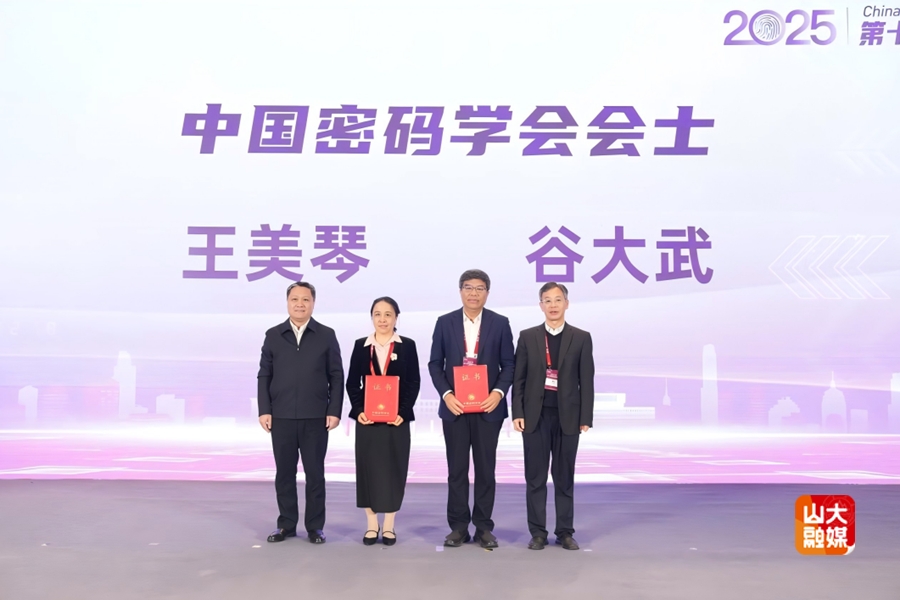[本站讯]11月8日至9日,第十八届中国密码学会年会在天津举行。会议期间颁发了2025年度中国密码学会荣誉奖项。山东大学副校长、网络空间安全学院王美琴教授当选中国密码学会会士,网络空间安全学院胡凯研究员荣获“优秀青年奖”,2025届博士毕业生林修汉(导师王小云院士)、何家辉(导师王美琴教授)入选“博士学位论文激励计划”。