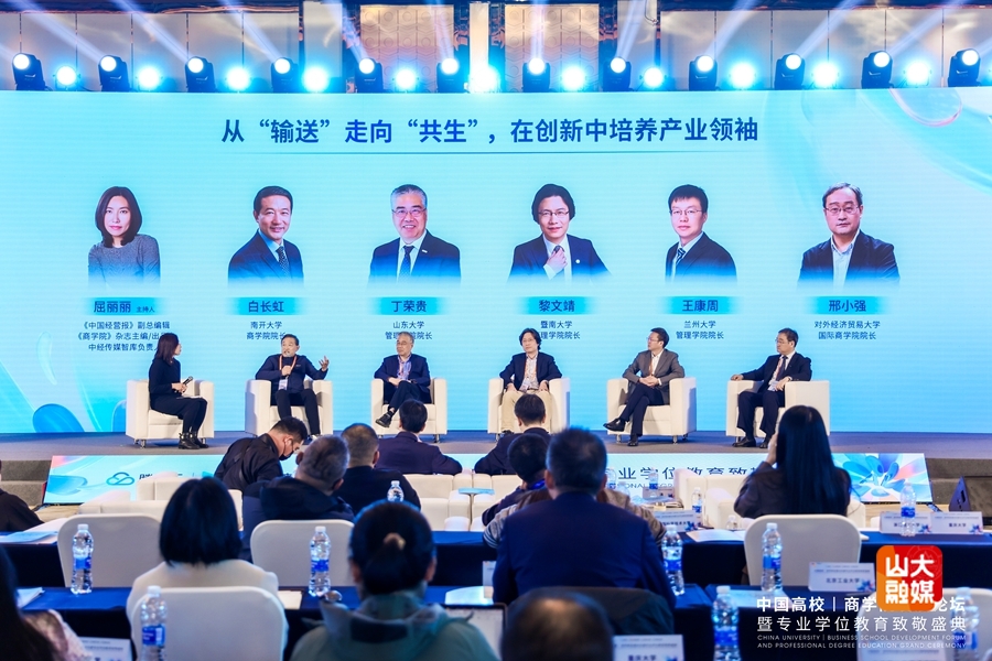在“院长之声”圆桌论坛环节,山东大学管理学院院长、MBA/EMBA教育中心主任丁荣贵教授与南开大学商学院院长白长虹、暨南大学管理学院院长黎文靖、兰州大学管理学院院长王康周、对外经济贸易大学国际商学院院长邢小强围绕“从‘输送’走向‘共生’,在创新中培养产业领袖”作主题分享。他表示,面对产业剧变,人才培养的范式必须重构,社会迫切需要的是具备跨学科思维与创新能力的“创造者”,山东大学商学院必须率先“拆掉认知的围墙”,推动深度学科融合,革新师资构成,培养能驾驭不确定性、支撑企业核心竞争力的新型人才。
