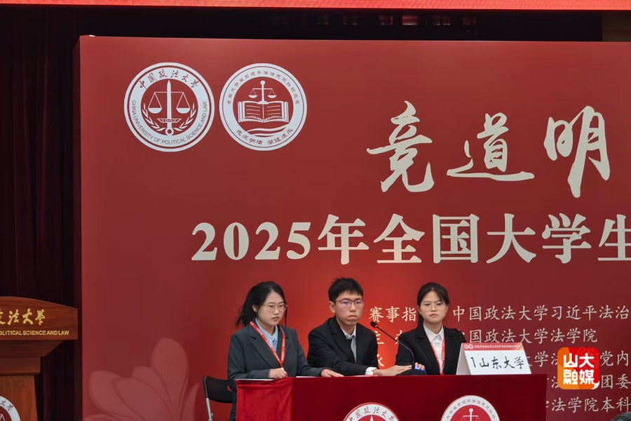 山东大学代表队由法学院李云龙老师担任指导教师,队员包括2023级本科生李鑫意、2024级本科生丁燕、2025级本科生李威鸣。在指导教师的悉心指导下,队员们刻苦备赛一月有余,系统梳理了习近平法治思想核心要义等有关知识,反复打磨竞赛技巧。在决赛抢答环节,山大代表队与北京师范大学代表队同台较量。队员们沉着应答、奋勇争先,展现出扎实的知识储备、冷静的心理素质和默契的团队协作。在演讲环节,李鑫意以“法脉薪传,治道长青”为主题展开分享,结合习近平总书记的法治实践足迹,生动诠释了法治精神的传承与发展,表达了青年学子践行法治思想、勇担时代使命的决心。