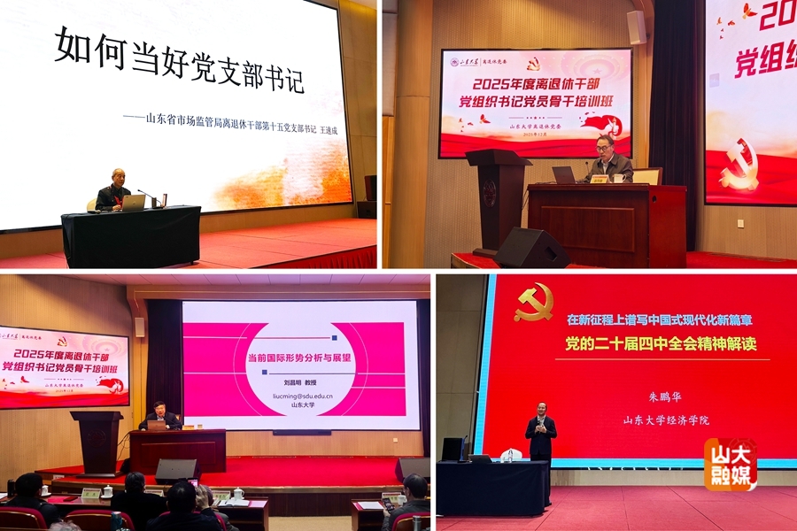 培训班上,全国离退休干部先进个人称号获得者王速成,山东大学教授刘昌明、副研究员朱鹏华,分别以“如何当好党支部书记”“当前国际形势分析与展望”“党的二十届四中全会精神解读”为题进行专题授课。离退休党委书记郭举修主持活动,并传达了《中共山东大学委员会关于认真做好党的二十届四中全会精神学习宣传贯彻工作的通知》。在经验交流环节,4位优秀党支部书记围绕离退休干部党支部建设、离退休干部党员管理、离退休干部党支部联学共建、引领老同志发挥作用等方面做经验分享。