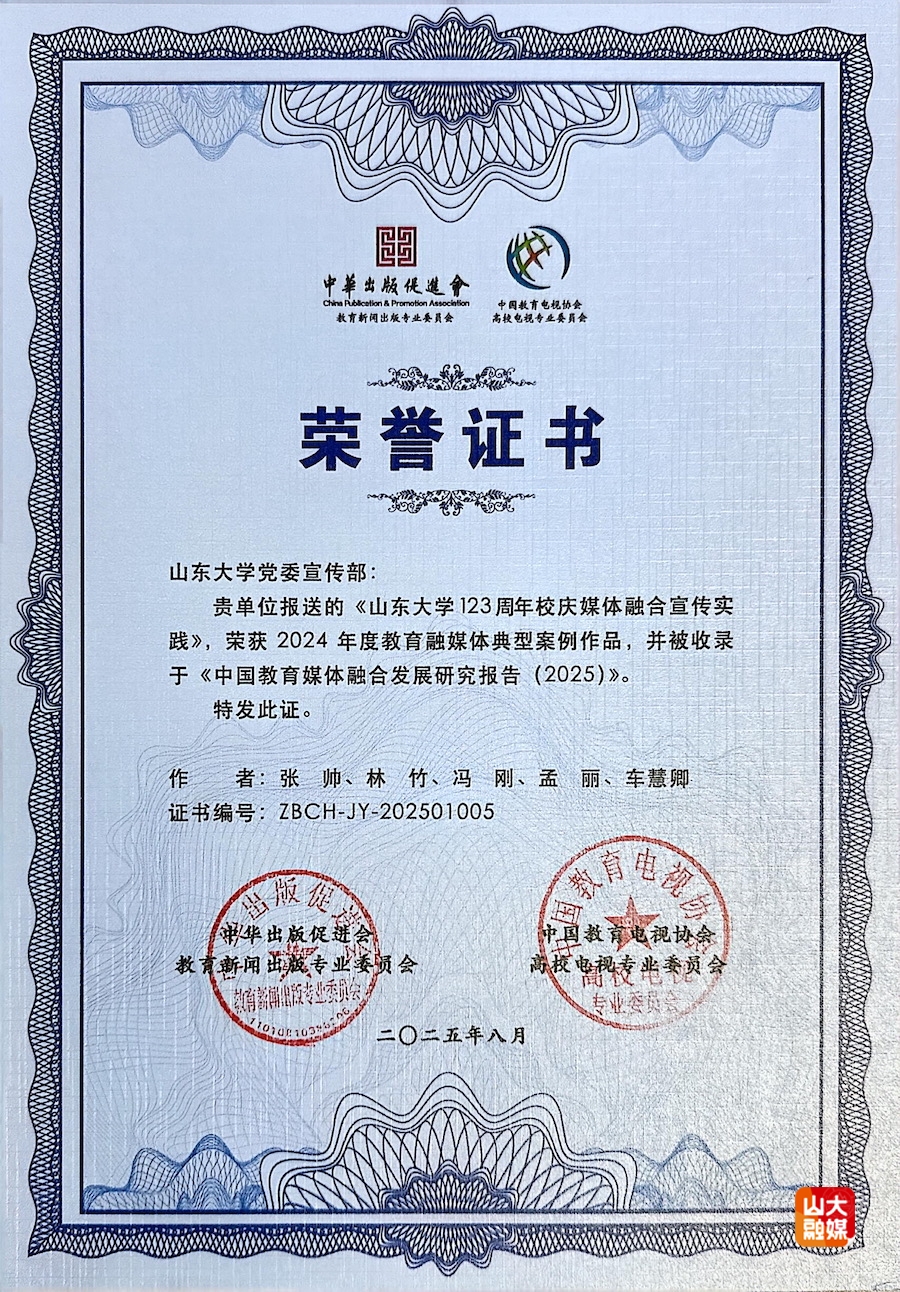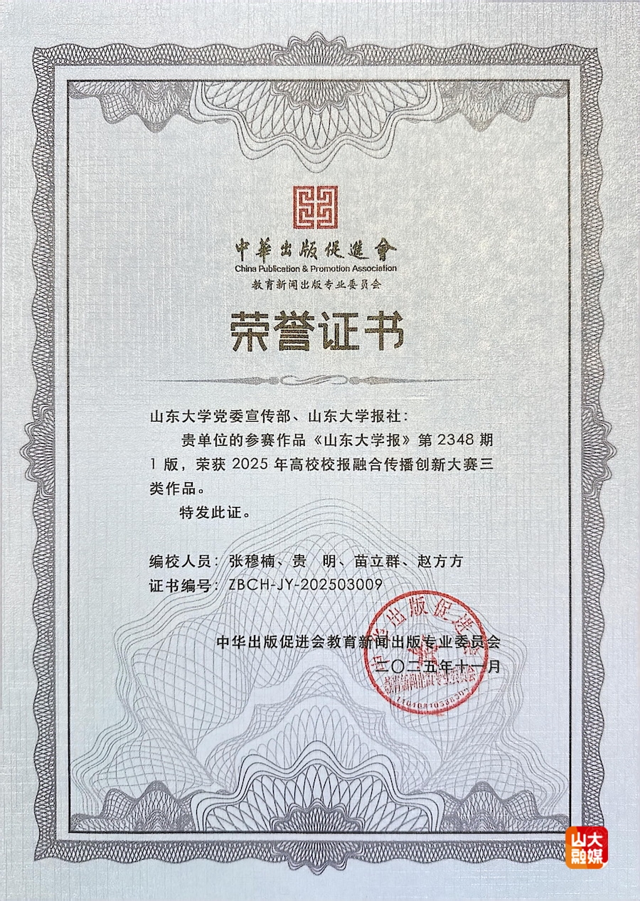 [本站讯]近日,“融聚智变 育见未来”中华出版促进会教育新闻出版专业委员会2025年年会在江苏无锡举办。我校报送的《山东大学123周年校庆媒体融合宣传实践》获“2024年度教育融媒体典型案例作品”,并被收录于《中国教育媒体融合发展研究报告(2025)》;《山东大学报》第2348期1版获“2025年高校校报融合传播创新大赛”三类作品。