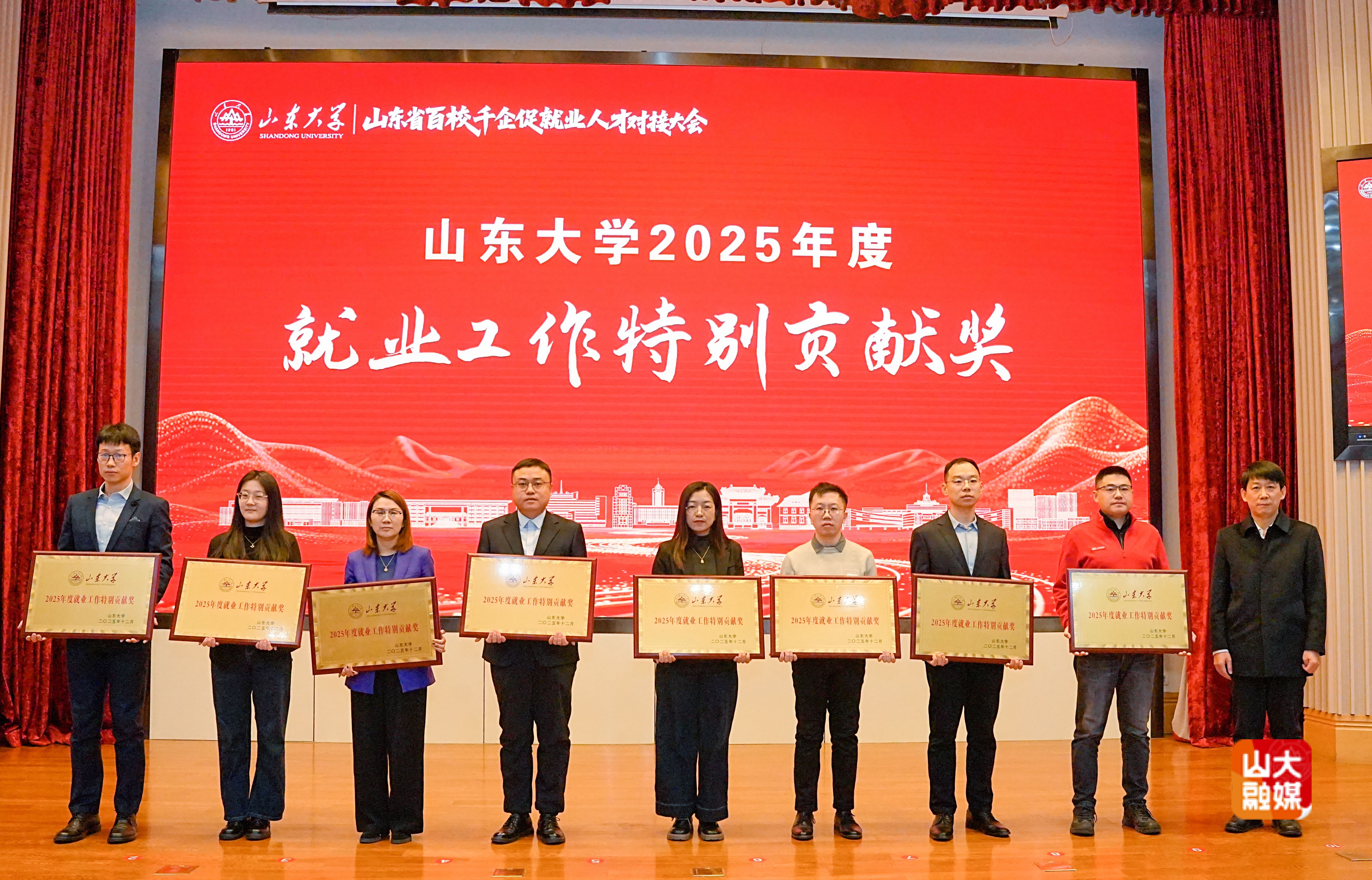 会议还为在促进山东大学毕业生高质量就业方面作出突出贡献的国家电网有限公司、中国建筑集团有限公司、华为技术有限公司、海信集团有限公司等16家用人单位颁发了2025年度山东大学"就业工作特别贡献奖"奖牌。