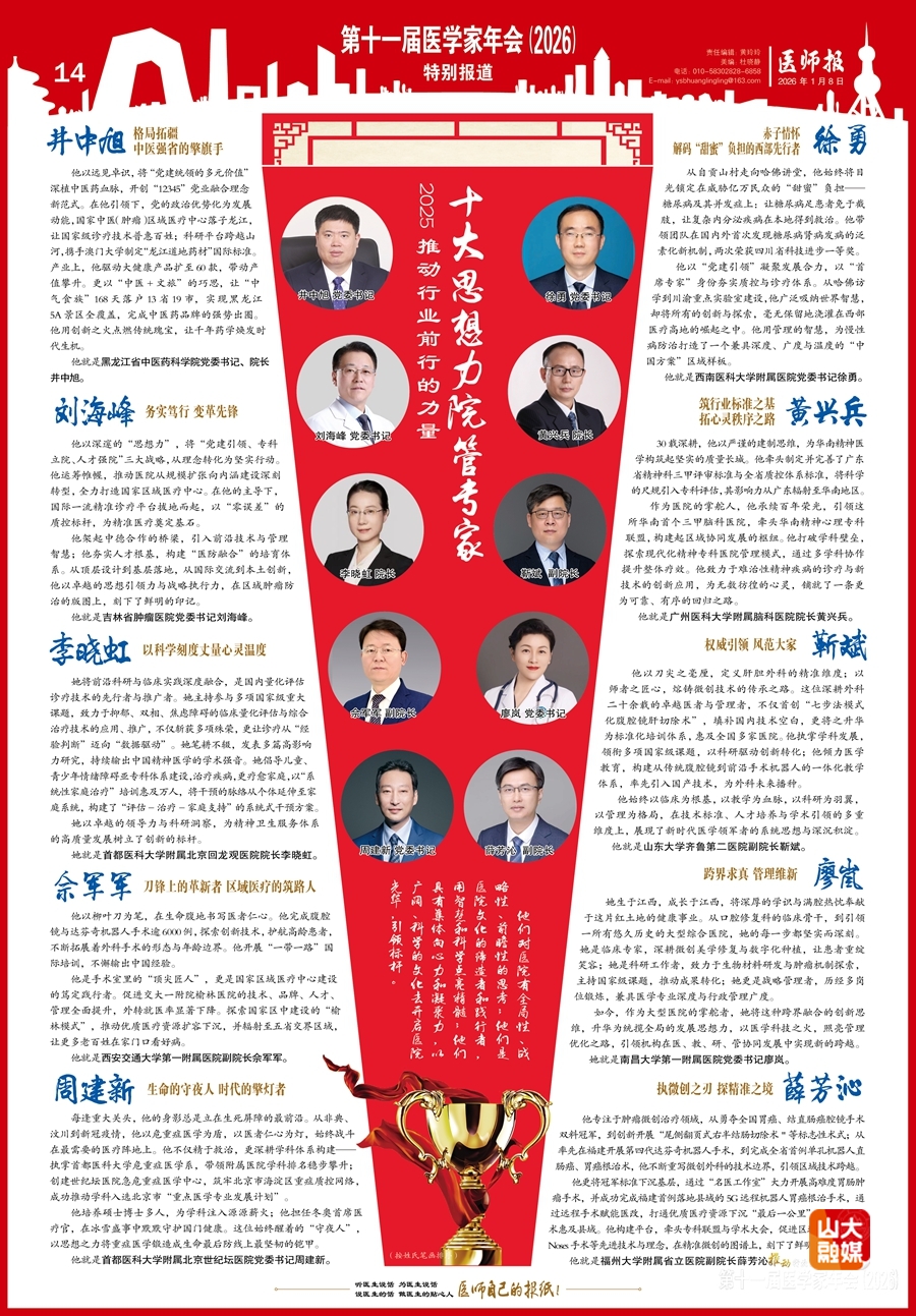 [本站讯]1月8日至10日,由医师报社主办,中国医药卫生文化协会、中国抗癌协会支持的第十一届医学家年会(2026)在北京召开。山东大学齐鲁第二医院副院长靳斌荣获“年度推动行业前行的力量——十大思想力院管专家”称号。