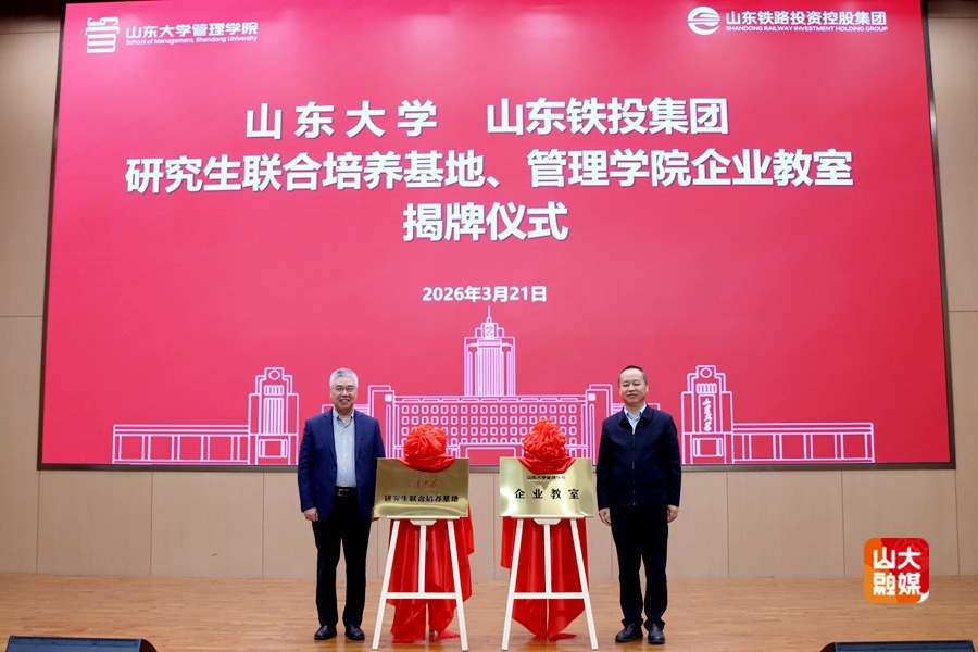 [本站讯]3月21日,山东大学管理学院首个企业教室在山东铁投集团正式揭牌,山东大学与山东铁投集团研究生联合培养基地同步设立。山东铁投集团党委书记、董事长王卫中,山东大学管理学院院长丁荣贵、党委书记付岩志参加活动。