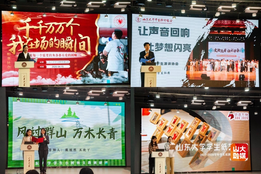 64个学生社团依次展示。答辩过程中,各类型社团各展所长、特色鲜明,充分展现了山大社团的蓬勃风貌与发展活力。学生心理协会聚焦心理健康,开展科普宣传与心理支持服务;学生演讲协会聚焦语言表达,组织演讲培训与赛事活动,提升学生沟通与思辨能力;学生纸艺社团立足传统纸艺,开展剪纸、折纸等创意实践,传承中华优秀传统文化;学生尼诺话剧社深耕戏剧创作与展演,提升校园文化氛围;学生自行车协会开展骑行实践与远征活动,践行青年社会责任;学生唐仲英爱心社坚持公益服务,扎实开展爱心帮扶与志愿实践;学生小树林支教调研团立足教育公益,提升乡村支教服务质量;学生春晖社聚焦支教助学与公益服务,推动志愿服务提质增效。